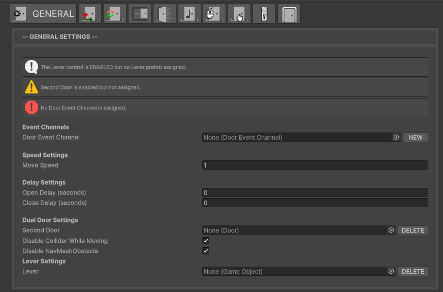 Dual & Lever Modes – toggle IsDualLeaf, IsLeverControlled, and timing fields directly in the custom inspector.